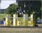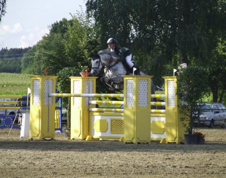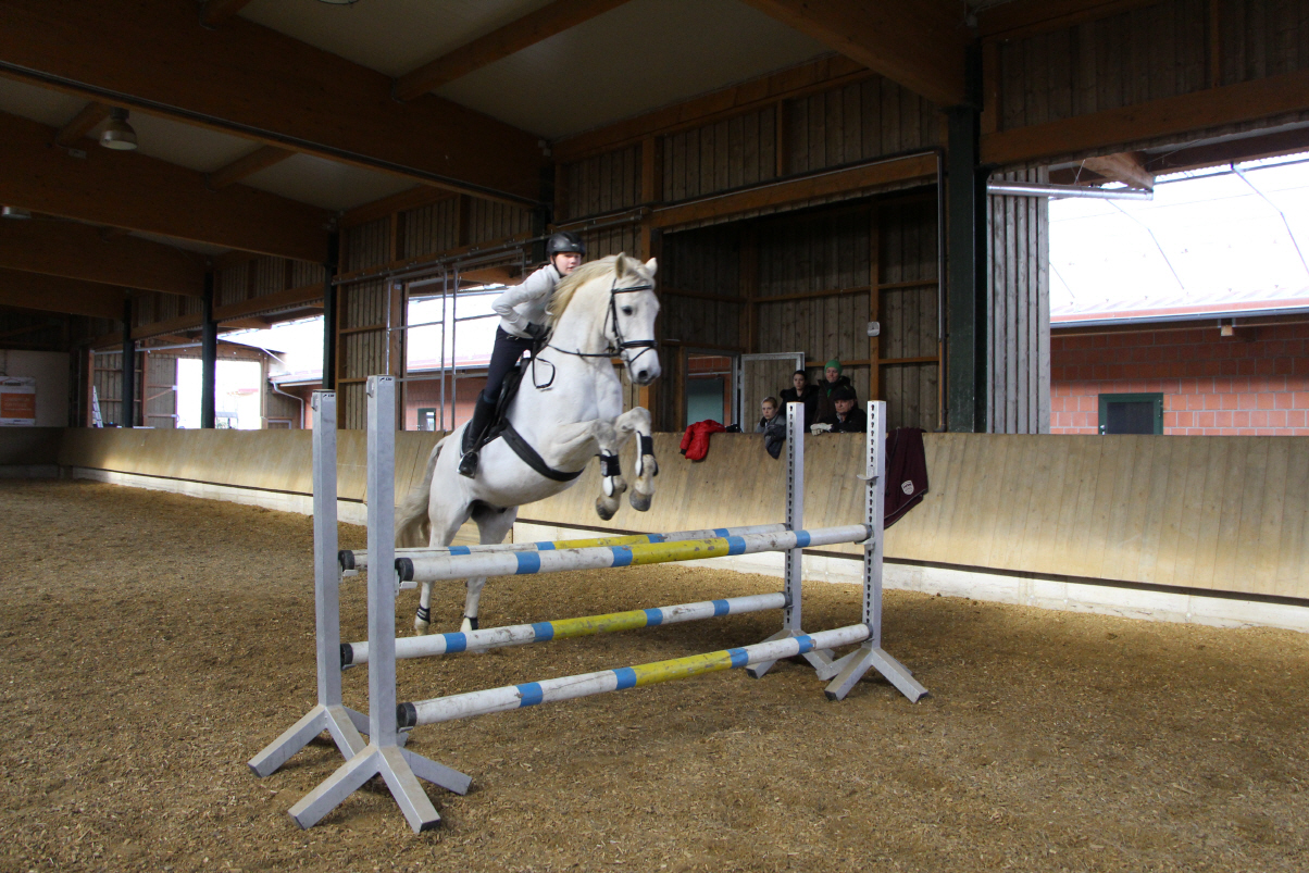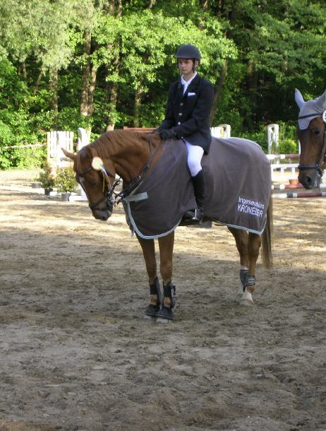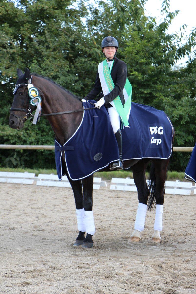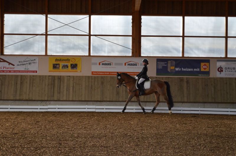 Die Tochter Julia reitet mit Ihrem Dressurpferd Fähnrich